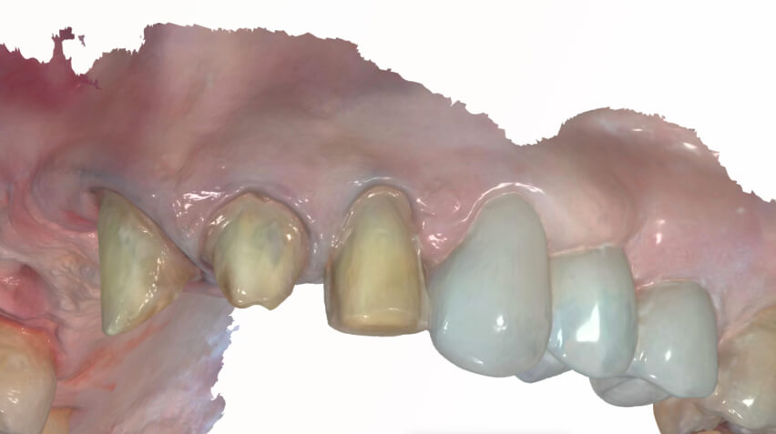 For the implant-supported bridge, the patient’s existing temporary bridge was carefully removed, and composite and Teflon tape were cleared from the access sites. Zimmer TSV 3.5 platform scan bodies were seated, and radiographs were captured to verify complete seating. Intraoral scans were then captured. Following the scans, the temporary bridge was re-cemented with Neo-Temp, and the final zirconia bridge with screw-retained abutments was ordered in Vita B1 shade. A Digital Design Preview was ordered to validate Dandy’s proposed designs prior to the subsequent delivery appointment for this patient.